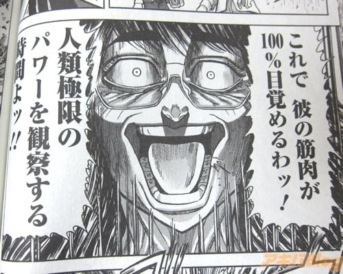 「これで彼の筋肉が100%目覚めるわッ!人類極限のパワーを観察する時間よッ!!」 |