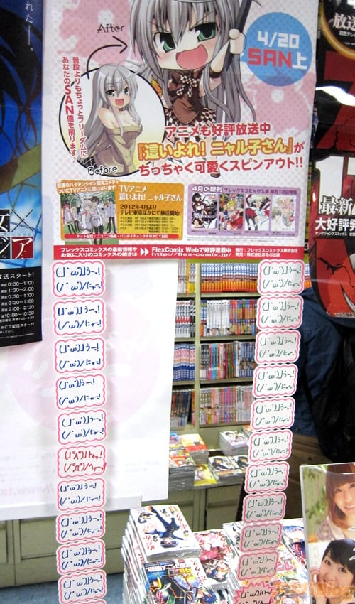 アニメ開始直前には、GA文庫の中の人のツイッターで1巻の売れ行きが急増もあったみたいで、 K-Books秋葉原新館にあった4月20日発売予定の4コマ漫画「這いよれ!スーパーニャル子ちゃんタイム」1巻の発売告知ポスターには、OP中毒者が続出という「(」・ω・)」うー!(/・ω・)/にゃー!」POPもたくさん付いてた。