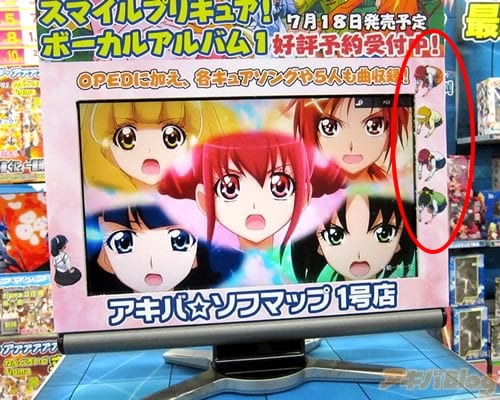 アキバ☆ソフマップ1号店は2階でCDを取り扱ってるけど、何故か4階でも『スマイルプリキュア!ボーカルアルバム1』の予約コーナーが作ってあり、「あざといは正義! ※」、デモを流してるモニタではアニメ5話の土下座、モニタ台ではアニメ13話に登場したみゆきの魚眼顔や、特設コーナー最上部にはアニメ7話に登場した掛け軸に「道」のプリキュア道がついていて、尼マイクさんいわく『ネタ満載でツッコミきれないww』とのこと。
