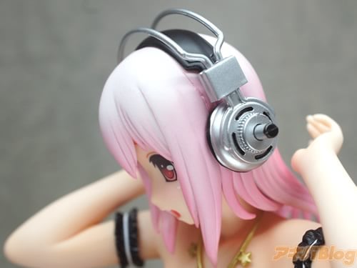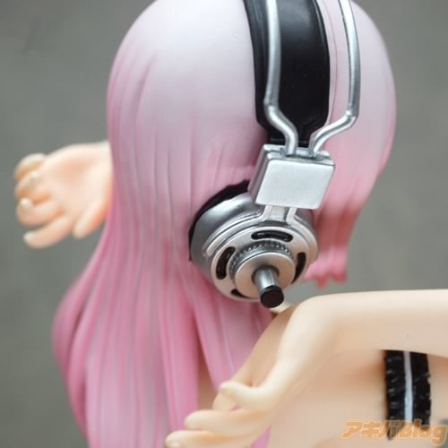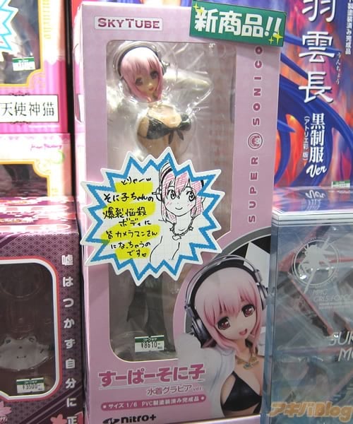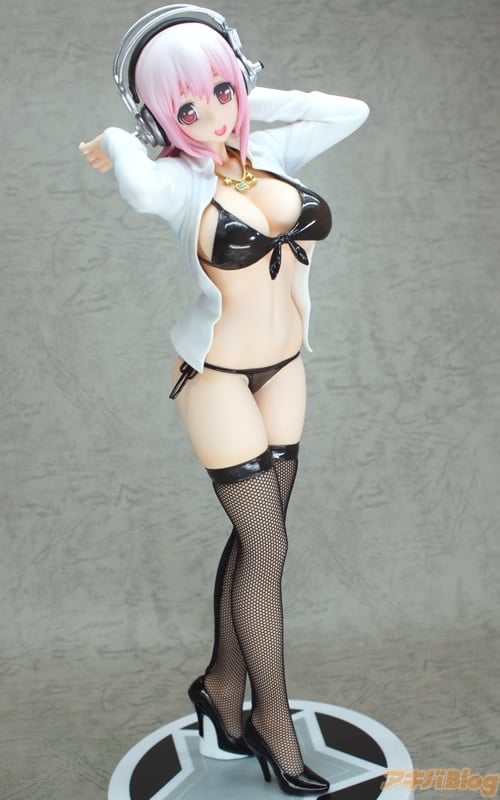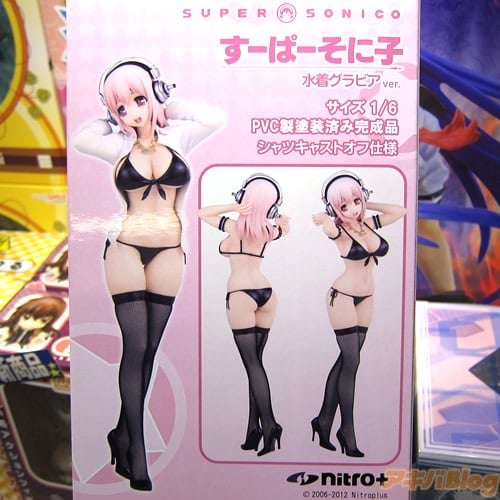 HOBBY STOCK通販によると『ゲーム「ソニコミ」(ニトロプラス)が絶賛発売中のすーぱーそに子がグラビアモデルとして活躍しているワンシーンをフィギュア化です!!黒の水着に合わせた編みタイツも刺激的。グラビアのお仕事に一生懸命取り組んでいるそに子ちゃんにご期待ください!』で、1/6スケールサイズで高さは約26cm。コトブキヤ秋葉原館のPOPでは『とりゃーwそに子ちゃんの爆裂悩殺ボディに皆カメラマンさんになっちゃうのです♥』になってた。