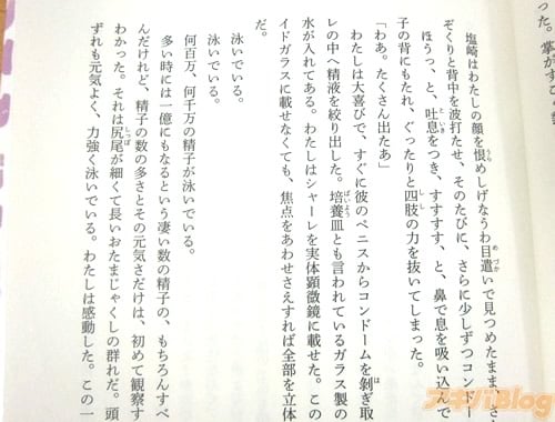 「わたしは大喜びで、すぐに彼のペニスからコンドームを剥ぎ取り、実験台の上のシャーレの中へ精液を絞り出した」「泳いでいる。泳いでいる。何百万、何千万の精子が泳いでいる」 |