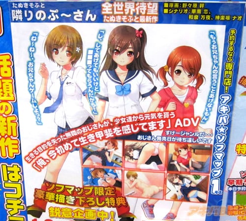 たぬきそふとから12月発売予定の美少女ゲーム「隣りのぷ~さん」【AA】が、アキバ☆ソフマップ1号店で予約ランキング入してた。予約POPによると『生きる目的を失った無職のおじさんが、少女達から元気を貰う”俺、今初めて生き甲斐を感じてます”ADV』みたいで、『すげえジャンルだ…おじさん発売日が待ち遠しいです』とのこと。