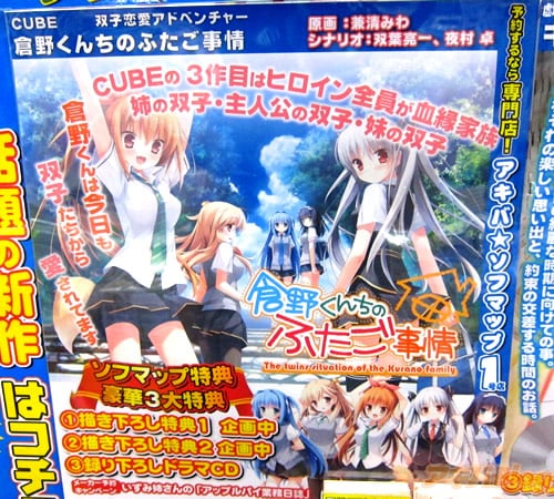 CUBEから11月発売予定の美少女ゲーム「倉野くんちのふたご事情」の予約が始まり、ソフマップAM館、アキ☆ソフ1号店で予約1位になってた。『大好きな長男と一緒に暮らす未来を賭けて、五人姉妹の「主人公争奪戦」がいま始まる!』というストーリーで、『ヒロイン全員が血縁家族』、『姉の双子・主人公の双子・妹の双子』みたい。