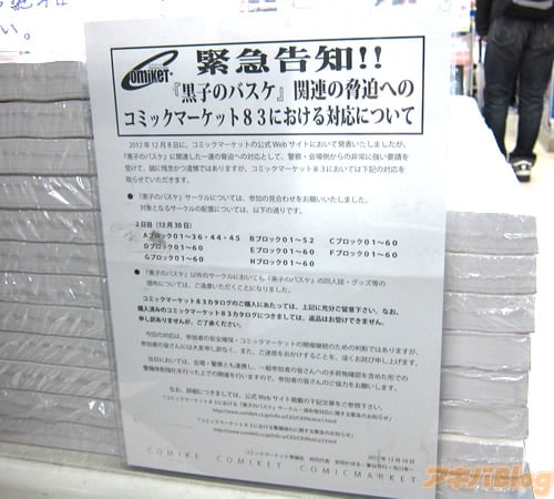 コミケットからの告知(公式ページ) 「"黒子のバスケ"関連の脅迫へのコミックマーケット83における対応について」 |