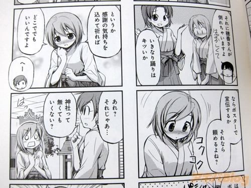 オビ謳い文句は『放課後は制服脱いで巫女になります!?』で、コミックス情報は『読んだ後は参拝に出掛けよう!女子高生4人の、巫女度100%部活動コメディ4コマ!!』、裏表紙『女子高生4人の、巫女度100%部活動コメディ4コマ!! 一言の言い間違いから生まれた…マニアックな部活動。活動内容=おせっかい!? 読んだ後は参拝に出掛けよう!』になってる。