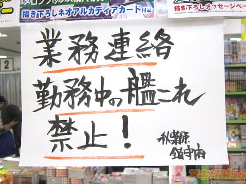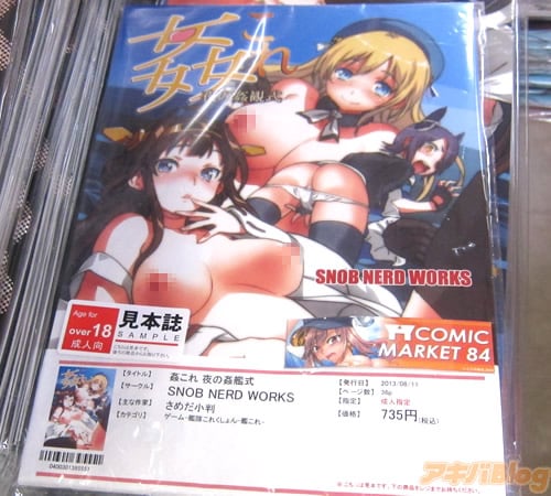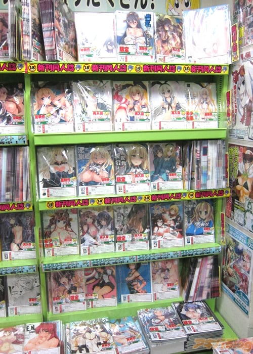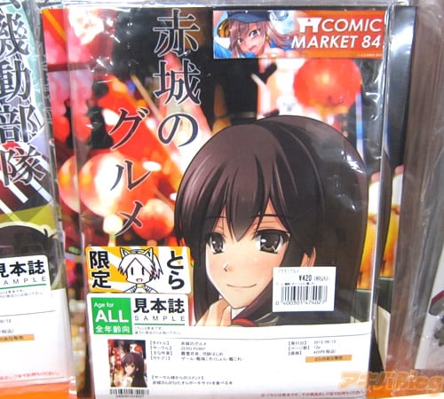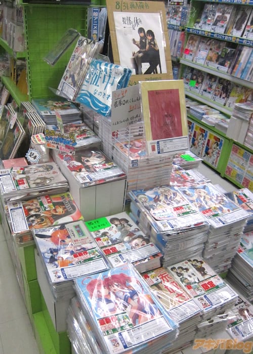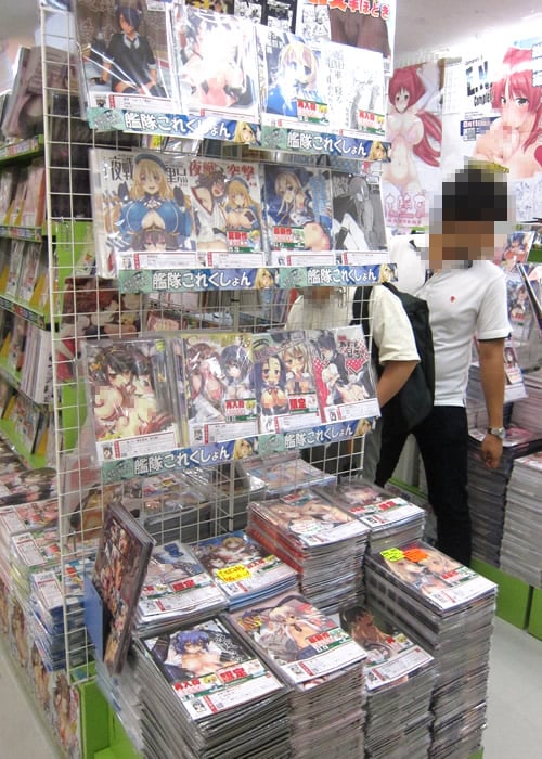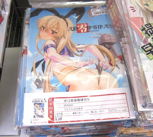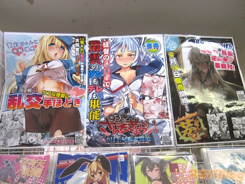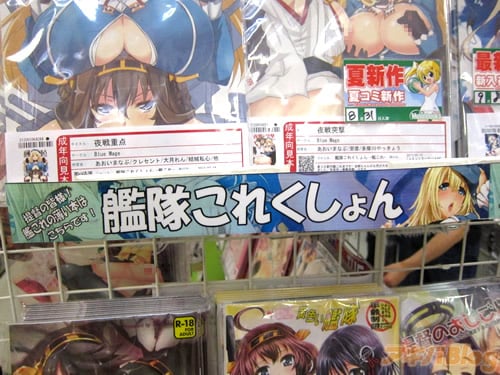 メロン秋葉原1号店では一般向け・大人向けそれぞれの同人コーナーで艦これ同人誌を展開し、メロン秋葉原2号店でも1棚まるごと艦これ同人誌の棚があり、とら秋葉原店Aの大人向け同人誌フロアでは、壁面棚3つ分が「艦これ」同人誌コーナーになっていて、店頭委託の同人誌の数の増え方は「ハルヒ」「初音ミク」のときみたいな感じ。