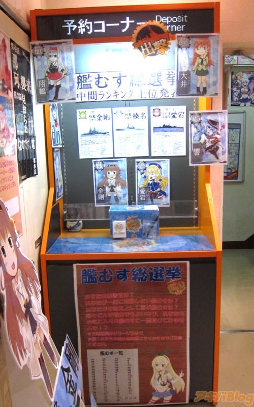 この艦これ人気投票「艦むす総選挙」は、とらのあな秋葉原店Aの5F・6Fエレベーター前の特設コーナーでやっていて、POPによると『あなたの秘書官は?あなたが一緒に夜戦したい艦むすは?あなたが中破以上して喜ぶ艦むすは?等々どんな理由でもよいので、あなたのお気に入りの艦むすに一票投じてみませんか!?』というもの。投票者のコメント入りでランキングを発表するみたいで、投票期間は26日まで。