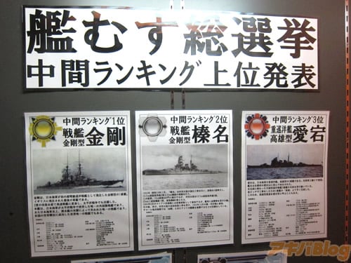 「艦むす総選挙」の中間ランキング上位の発表は、軍艦写真入りでスペックや各艦のエピソードなどを紹介したランキングになっていて、1位「戦艦金剛型 金剛」、2位「戦艦金剛型 榛名」、3位「重巡洋艦高雄型 愛宕」だった。