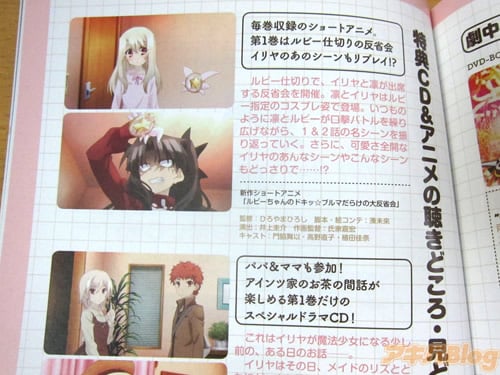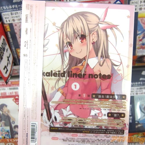 BD1巻には、製品情報によると1話「誕生!魔法少女!」、2話「誰?」と、新作ショートアニメ「ルビーちゃんのドキッ☆ブルマだらけの大反省会」や、オーディオコメンタリーを収録し、特典にドラマCD「アインツ家集合! 家族の団欒CD」、特製ブックレット「kaleid linernotes」、着せ替えクリアケース、デジパック、特製クラスカード「アーチャー」が付いてて、ナナミの雑記部屋さんの感想には「見える、見えるぞぉ!イリヤちゃんの割れた桃尻!ツルペタちっぱい!弄り回してぇよ〜、このロリ裸。ぶひいいいい!!」などなど。