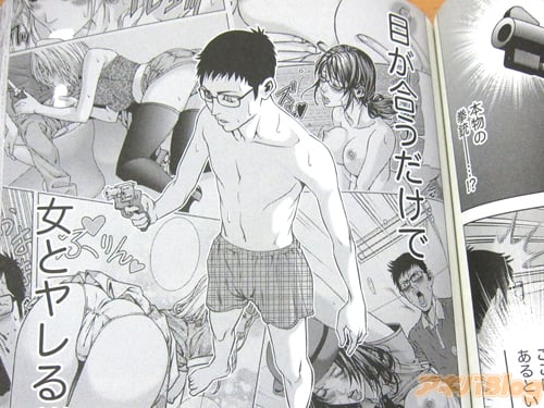 オビの謳い文句は『目が合うだけで、いきなりHになっちゃう?究極のフェロモンを手に入れた主人公が出会った美女たちを落としまくる!!』、オビ裏面『携帯サイト「さきっちょパラダイス」で大人気作品のコミックス化!!不思議な能力を手に入れたら何に使う!? 』、1ページ目から『最強フェロモンで女を落とせ!!』になっていて、セミを助けたら女性と目があっただけでヤレるという能力をもらい、主人公と目を合わせた女性たちとヤリまくってるお話。