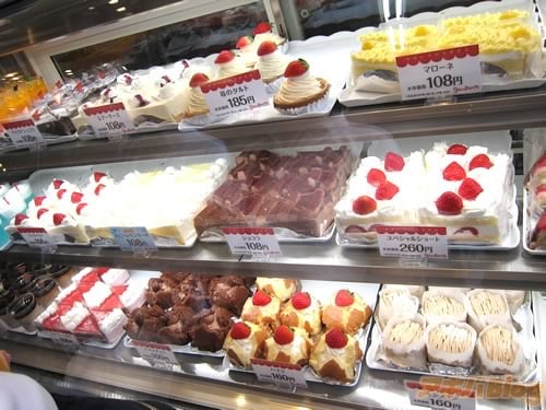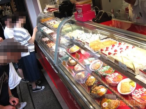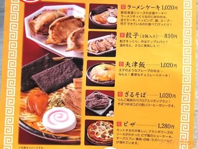 『スイーツパラダイスケーキショップ ヨドバシ秋葉原店』では、ショートケーキ、モンブラン、ティラミス、ベイクドショコラ、ハニーレモンケーキ、レアチーズ、苺のタルトなどなど、ベーシックなケーキを108円から販売している(ラインナップ一覧)ほか、ラーメン・餃子・天津飯の中華料理、ピザ・オムライスといった洋食の本物そっくりに作ったフェイクスイーツ・駅前食堂シリーズも提供(おかもち型の専用ケースもあり)していて、霜降り肉や、マルちゃん監修の「緑のたぬき」&「赤いきつね」ケーキのスイーツもあった。