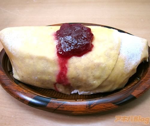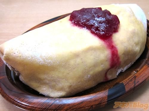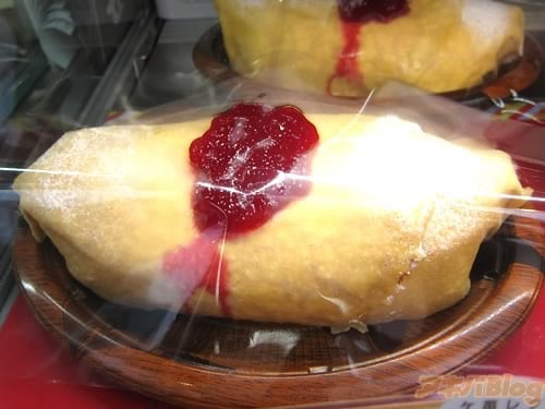 「クレープで包んだレアチーズムースにいちごソースのケチャップのせ」