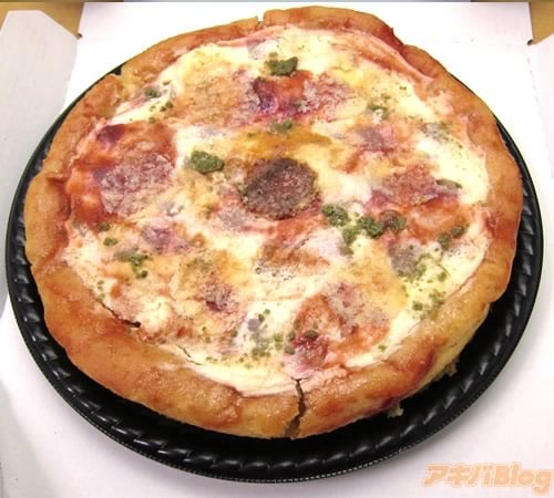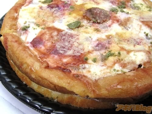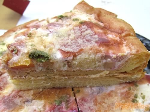 「カットするのが楽しい、フランボワーズソースがかかったピザ風のシューケーキ」