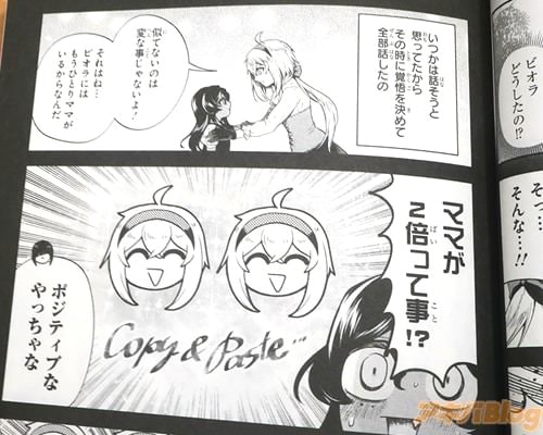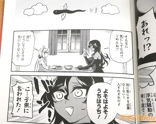 今回発売になった「でこぼこ魔女の親子事情」6巻【AA】には、第34話から第39話と番外編9・番外編10を収録(もくじ)し、オビ謳い文句は『でっかい娘と小さい母の見た目逆転母娘コメディ!』だった。