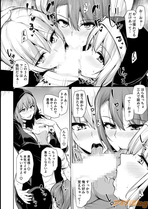 さっそく路地裏で勇者チ◯ポを取り出してトリプルフ◯ラを開始。異世界で最初に関係を持った3人ということもあり、好みを熟知されている口遣いにあっけなくフィニッシュ!口の中にも顔面にもぶっかけてチャージ完了です。