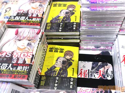 今回発売になったコミックス「雷雷雷」1巻【AA】には第1話〜第3話と「おまけ」、キャラクター設定を収録(もくじ)し、オビでは漫画家:ONE氏が『躊躇ない展開、暴走、破壊、変態。激化していくのが、面白い』、漫画家:コトヤマ氏は『かっこいい、可愛い、熱い、抜けた空気、本当に助かります。憧れています』をコメントされ、裏表紙は『働く少女とエイリアン、接近遭遇!』などだった。