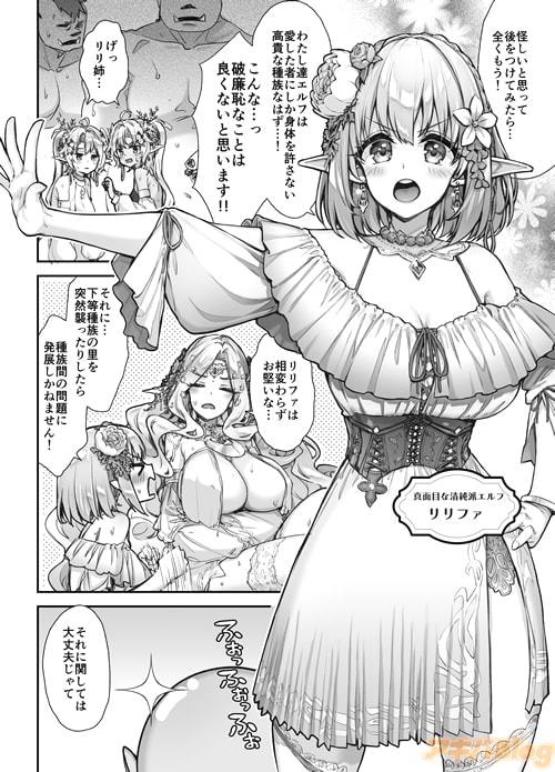 しかしここで乱交にストップをかける乱入者が登場。エルフの里のお堅い清純派である「リリファ」が「こんな…っ 破廉恥なことは良くないと思います!!」と待ったをかけるのです。ところが今回の乱交エッチは、オーク側にも根回しが行われた公式イベントだったのです。説き伏せられたリリファは、勢いで乱交イベントに参加することに…!