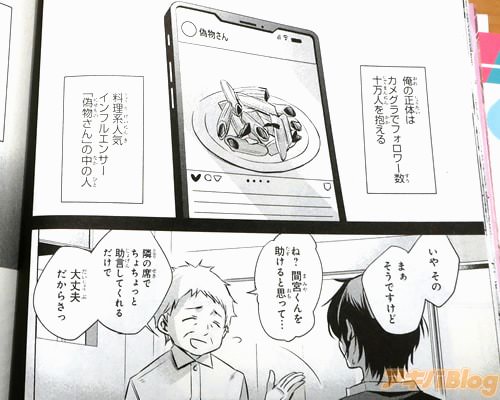 また、コミックス情報は『広告会社で働く陰キャの社内エンジニア・藤城の隣の席に、ミスコンで優勝したこともある巨乳で美人な先輩社員・間宮さんが移動してきた。藤城がSNSに詳しいという情報を得た間宮さんは、フォロワーの増やし方を教えて欲しいようだが…。間宮さん、実はかなりのぽんこつさんでした!自分が間宮さん憧れのインフルエンサー「偽物さん」であることを隠しつつ、間宮さんをはじめ、同僚のクール系美女やからかい上手な女子高生といった個性豊かなヒロインたちと織り成す、珠玉のオフィスラブコメディー!』になってる。