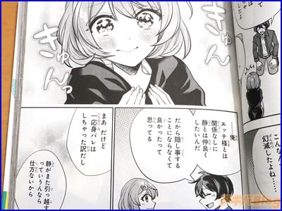 今回発売になったコミカライズ「ネットの“推し”とリアルの“推し”〜」1巻【AA】には第1話〜第5話と書き下ろし小説「静の旅立ち」を収録(もくじ)し、折込チラシは『推していいのは、私だけ…だよ?』、オビ謳い文句は『憧れの女の子との共同生活に理性が限界突破!?』で、裏表紙は『予測不可能な「推し」たちとの一つ屋根の下ハーレムラブコメ、開幕!』などだった。