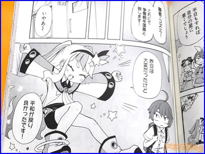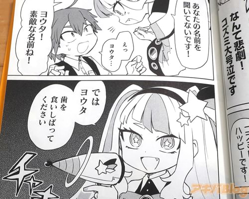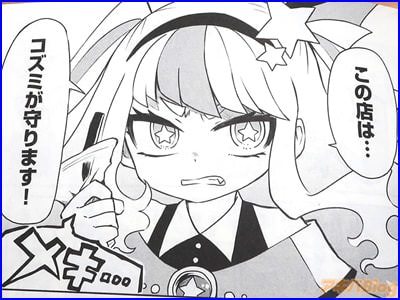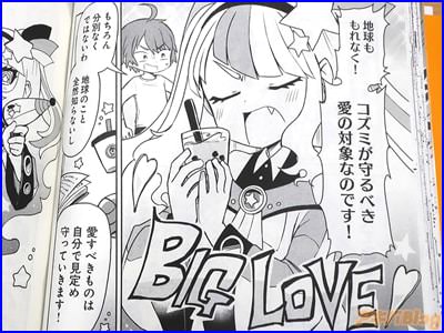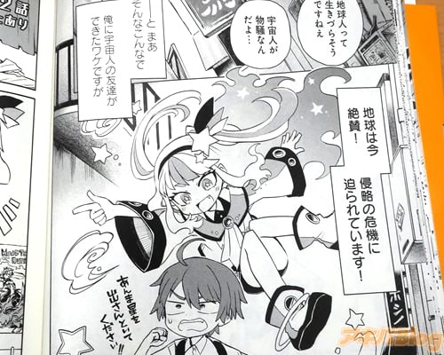 今回発売になった「地球はコズミのものなので!」1巻【AA】には第1話から第10話と「描き下ろし」を収録し(もくじ)、裏表紙は『続々とやってくる宇宙人たちとの戦いや、彼らに負けない個性を持つ地球人たちとの交流を描く、コズミック日常コメディ』で、オビ謳い文句は『おまたせ!侵愛なる民たちよ』だった。