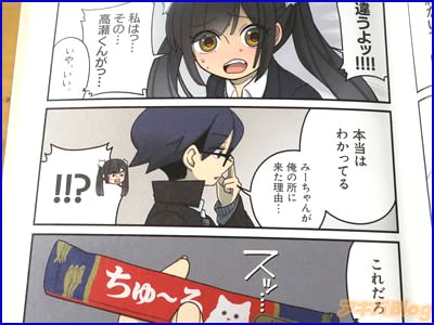 裏表紙は『愛でていた猫の正体は、隣の席のクラスメイト!?』などで、オビ謳い文句は『猫!?それとも人!?』、『猫大好き&人間キョーミなしの高瀬くんと、人間に変身できる猫のみーちゃんの、猫まみれラブコメ!』になってた。