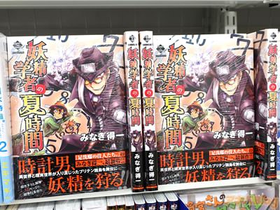 今回発売になった「妖精学者の夏時間」【AA】には、第1話から第5話を収録し、オビ謳い文句は『異世界と現実世界が入り混じったブリテン諸島を舞台に――時計男、妖精を狩る!』、『「足洗邸の住人たち。」のみなぎ得一、最新作!』、『描き下ろし加筆16ページ!初単行本化!』、裏表紙は『召喚した妖精を使って怪異と戦う妖精学者は、新たな妖精の勧誘のために案内人・ギリー・ドゥーの手引きでグレートブリテン島を訪れていた。しかし、最初に遭遇したのはスコットランド最凶の邪妖精で――。最強戦力“時計男”の知られざる足跡とは!?』だった。