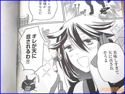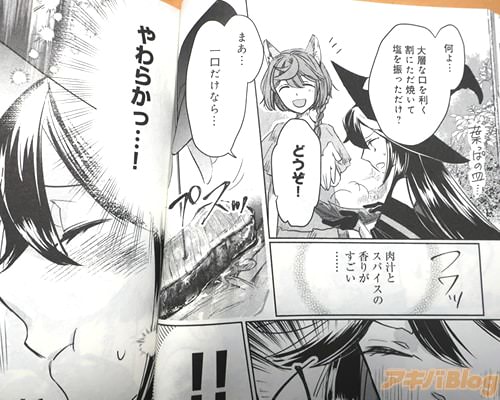 今回発売になった「転生魔女の気ままなグルメ旅@COMIC」1巻【AA】には、第1話から第4話と、番外編、書き下ろし小説「エゴイスト魔女な理由」を収録し(もくじ)、裏表紙は『「料理は任せてください、魔女様!」「何これ美味すぎるわ…!」』で、オビ謳い文句は『世界中の美味しいもの(魔物)を食べて回るのよ!』、『描き下ろし漫画&原作者書き下ろし小説W収録!』、『食欲満点魔女様がついでに世界も救ってしまう?自由気ままな勘違いグルメアドベンチャー!』だった。