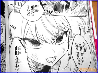 今回発売になった「となりの殺し屋ちゃん」1巻【AA】には第1話〜第5話を収録し、裏表紙は『“普通の女の子”を目指すA子だが…実はポンコツ&コミュ障だった!?殺し屋を追う、女子高生の乃々となぜか仲良くなったり…殺し屋組織“オロチ”から元同僚が追って来てバトルも勃発!』で、オビ謳い文句は『元殺し屋の山田A子、人生やり直します』、『女子高生との【友情】×殺し屋【アクションバトル】コメディ!』だった。