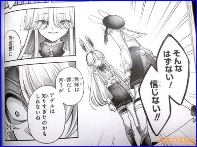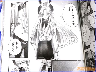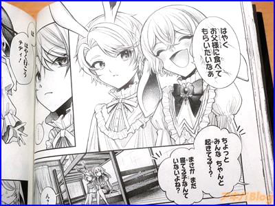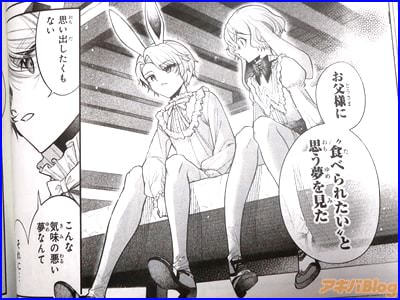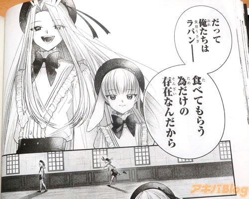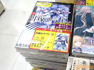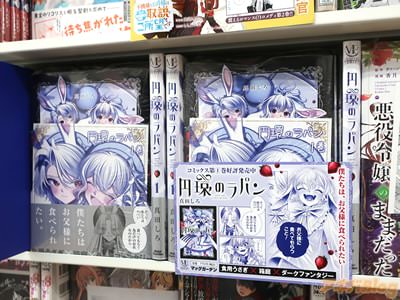 今回発売になった「円環のラパン」1巻【AA】には、第1話から第4話を収録し、オビ謳い文句は『僕たちはお父様に食べられたい』、『食用うさぎ×箱庭×ダークファンタジー』、裏表紙は『ねぇ、テディ…ぼくをこの館から連れ出してほしい』で、アキバでは販促POP『僕たちは、お父様に食べられたい――』が付いていた。