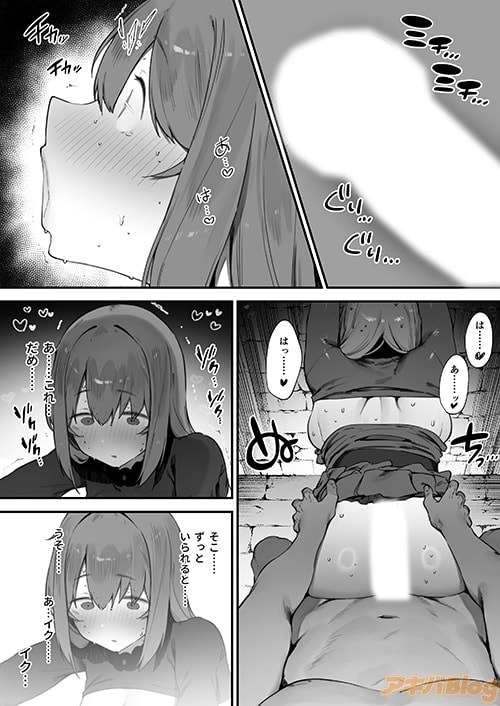幼馴染とは比べ物にならないほどの巨根を、奥までぬぷぅーー♡とハメただけで、背筋に快感が走りまくる美少女冒険者。垂れ下がる巨乳の乳輪も充血しちゃってますね。震える全身や息を荒げる艶姿は、にぎりうさぎ先生渾身の描画。髪のせいで隠れている目元も、快楽でトロけてるんだろうなぁ……と妄想がはかどるショットです。