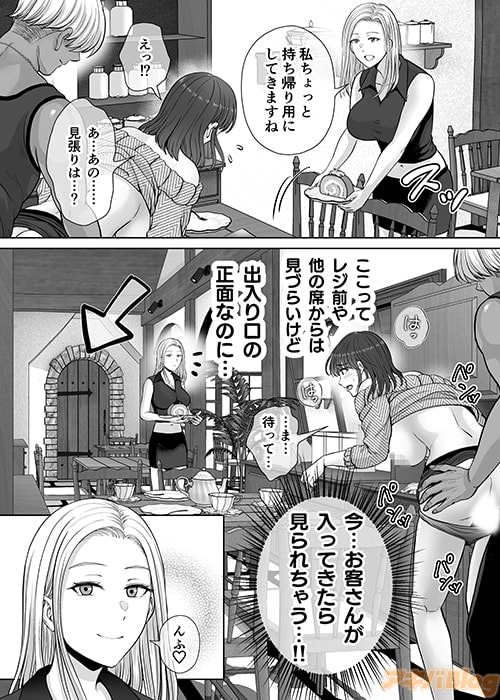 舞台はカフェの店内へ戻って、他の客の目を盗みながらテーブルに乗り上がり、巨乳むきだしの半脱ぎ着衣セ◯クスがスタート。人目を意識することで性感がより高まり、奈緒子は完全に色ボケな反応で浮気交尾をむさぼります。