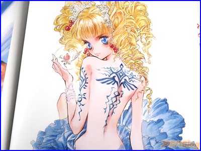 今回発売になった「いのまたむつみ画集MIA」【AA】には、「新世紀GPXサイバーフォーミュラ」シリーズや、「テイルズ オブ」シリーズ、などなどのイラストや、オリジナルイラストのほか、ラフデザイン、オリジナルジュエリーの制作過程なども収録され、オビ謳い文句は『愛を注いで描き続けた猫と少女のオリジナルイラストから、アニメ「新世紀GPXサイバーフォーミュラ」、ゲーム「テイルズ オブ」シリーズ、未公開ラフまで、近年の作品を集めたファン必携、永久保存版のオリジナル画集』で、裏表紙はメッセージカードのプレゼント企画告知、折込チラシでは複製カラーイラスト色紙がセットの限定版(期間限定販売)の告知もあった。