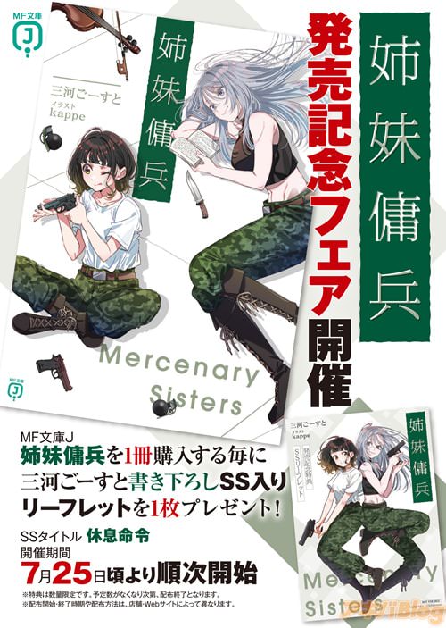 対象書店で「姉妹傭兵」を1冊購入する毎に、三河ごーすと先生書き下ろしSS入りリーフレットを1枚プレゼント!詳細はMF文庫J公式サイト内の編集部ブログをチェック!