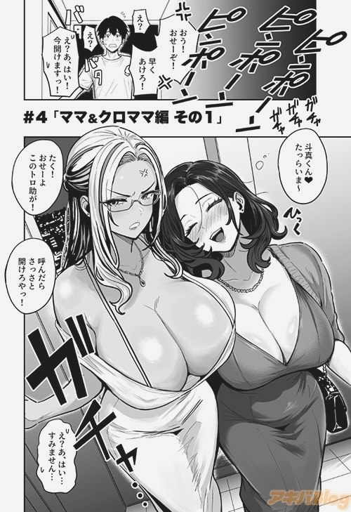 同居人であるギャル「きゃぴ子」「じと美」の双子姉妹と、その従姉妹「クロ」がアメリカ旅行へ旅立った夜。家のチャイムを鳴らすのは……ゴキゲン気分になっちゃったママさんと褐色の巨乳美人。向かって右側の女性が「きゃぴ子」「じと美」の母親、左に立つのが「クロ」の母親です。