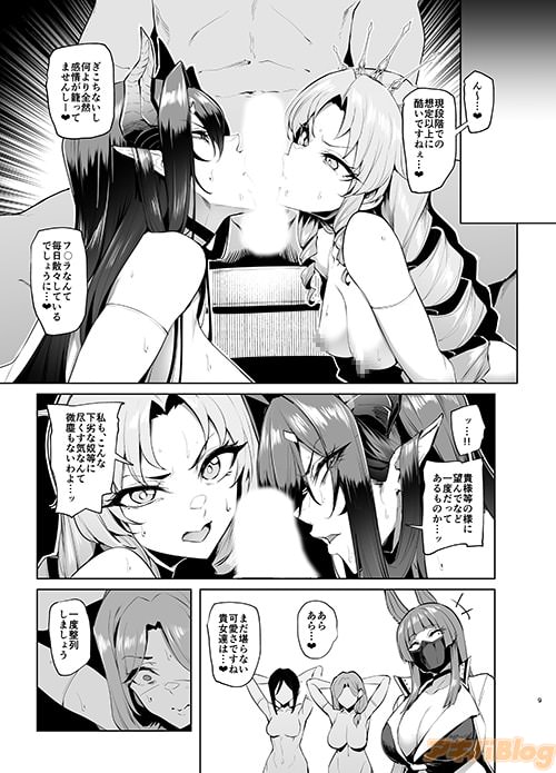 こんな凶悪チ◯ポでヤられたら身がもたないと恐れた女帝と輝姫は、さっきとは態度が一転。お情けを求めて媚びっ媚びに熱心な舐めフ◯ラを頑張るのでした。大口あけてくわえてもハミ出す先端をすすり、血管ビキビキの竿に舌を這わせ……さあ、これでスーパーおチ◯ポ様は手加減してくれるかな?