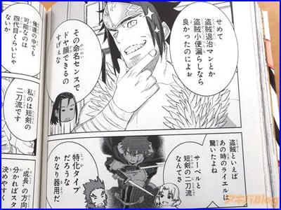 コミカライズ「セブンス」3巻【AA】には第12話から第16話と、「冒険者設定資料」を収録(もくじ)し、オビ謳い文句が『先代から「アーツ」の力を譲り受けたライエルが、アリア救出に向かう!』、裏表紙は『アリア奪還のため、ライエルは討伐隊を率いて出撃する』、『寄せ集めの部隊を囮にし、盗賊達のアジトに侵入するライエル』で、コミックス情報は『先代から「アーツ」の力を譲り受け、いざ盗賊討伐へ!』などになってる。