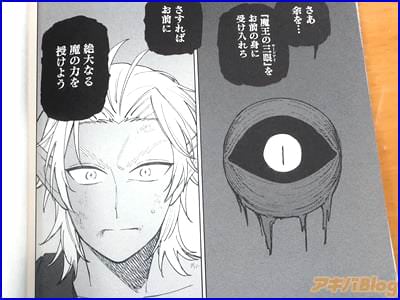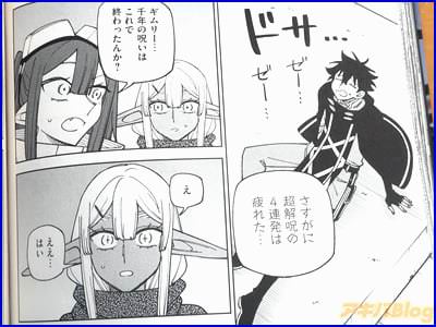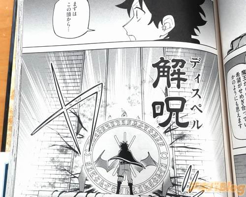 なお、裏表紙は『ダークエルフの長・ミネルバの救出に向かうゲイルたちを、魔王の従者であるガーゴイルの群れが阻む!護衛のアスゲイトの剣は実体を持たないガーゴイルを虚しくすり抜け、さらに逃げられないようゲイルたちは四方を取り囲まれてしまう。攻撃も退避も敵わない相手にゲイルの解呪だけが有効な手段と判明し…。魔王城の地下を舞台に、遂に呪いを極めし呪具師ゲイルとミネルバとともに在る4つもの「魔王シリーズ」との決戦が始まる!』になってた。