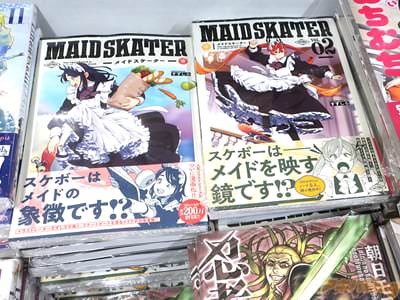 すずしろ氏のコミックス「メイドスケーター」2巻【AA】がアキバでは6日に発売になった。裏表紙は『先輩メイドとスケボー特訓したり、技の開発をしたり…――お屋敷の主人が登場!?』で、オビ謳い文句が『「メイドの嗜み=スケボー」な世界の日常を描く、新感覚メイド漫画!』などだった。