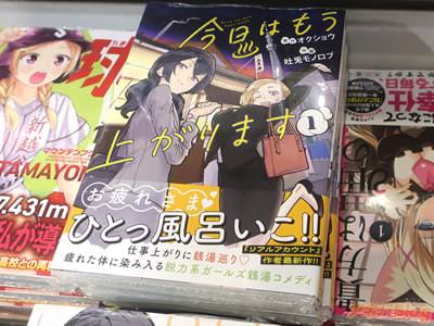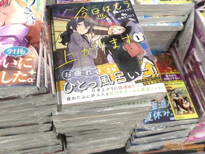 今回発売になったコミックス「今日はもう上がります」1巻【AA】には、第1話〜第7話の「鶯谷 ひだまりの泉 萩の湯」、「秋葉原 RAKU SPA 1010 神田」、「東上野 寿湯」、「成田空港温泉 空の湯」、「錦糸町 黄金湯」、「小杉湯原宿」、「押上温泉 大黒湯」と、「特別番外編」を収録(もくじ)し、裏表紙は『実際に行ける!体験できる!実在湯巡り♥』、『毎日、頑張りすぎてるアナタに…湯ったり銭湯コメディ♥』で、オビ謳い文句は『お疲れさま♥ ひとっ風呂いこ!』、『仕事上がりに銭湯巡り♥ 疲れた体に染み入る脱力系ガールズ銭湯コメディ』だった。
