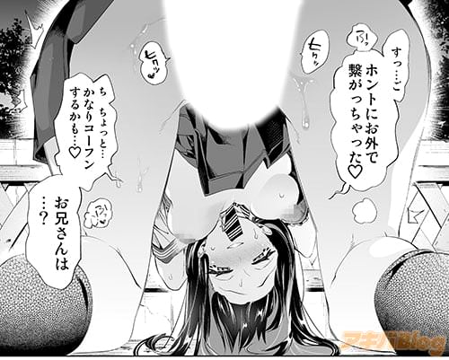 乱れたスカートや垂れたネクタイ、ソックスなどが映り込み、セーラー服コスプレを強調する構図もお見事です。彼女はこの回までホテルやお家でのHが主で、野外でヤる場面は初となるため、読者にとっても新鮮なシーンとなっています。