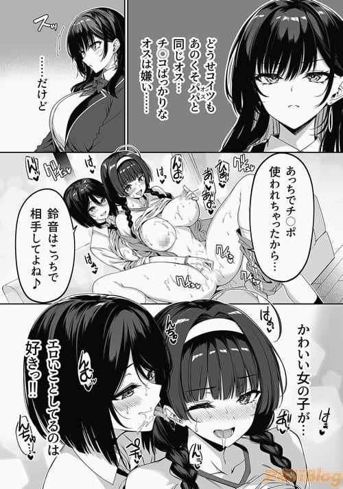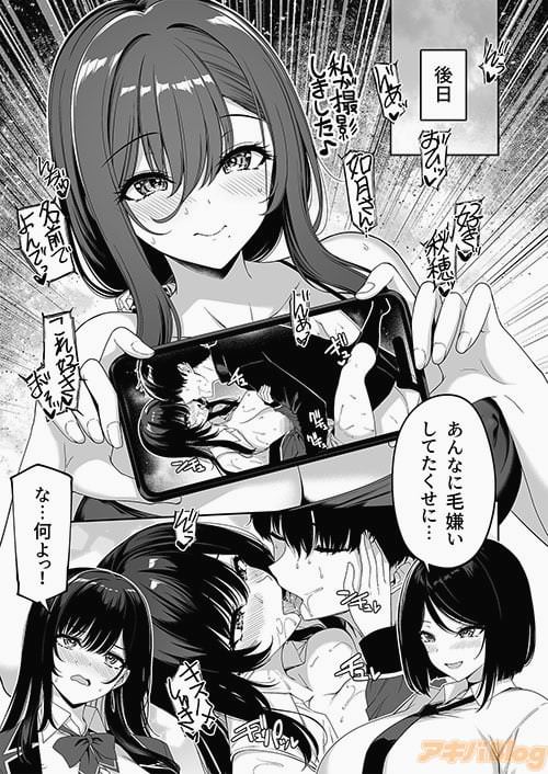 すっかり男嫌いの詩乃花ですが、その反動からか、女子がエロいことをする光景は大好き。秋穂たちにエッチを教える指南役のギャル「淵瀬スミレ」が鈴音を膝に乗せて、オマ◯コをいじりながら耳しゃぶしてキャッキャウフフと気持ちよくなっている女同士の痴態を、詩乃花はドキドキムラムラしながら見物しています。