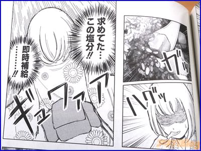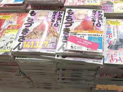 今回発売になったコミックス「ドカ食いダイスキ!もちづきさん」3巻【AA】には第12話〜第17話と、「【セブン-イレブン】トクベツ編」、描き下ろしを収録(もくじ)し、発売日のメロン秋葉原1号店には既刊とともに展開した特設コーナーもあり、オビ謳い文句は『1・2・3巻の総摂取カロリー、141,327kcal超!累計発行部数70万部♥』で、裏表紙は『一刻も早く、早く食べたい…!』、『ストレス・空腹…我慢の限界!欲望リリース食べま狂(くる)♥』などだった。
