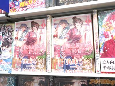 桂真琴氏のライトノベルを高岡ゆう氏がコミカライズされている「転生厨師の彩食記 異世界おそうざい食堂へようこそ!」1巻【AA】がアキバではもう出てる。オビ謳い文句は『主婦、香織。異世界で食堂を開店――!?』で、裏表紙は『43歳主婦が…交通事故に遭い、中華風異世界に転生!』になってた。