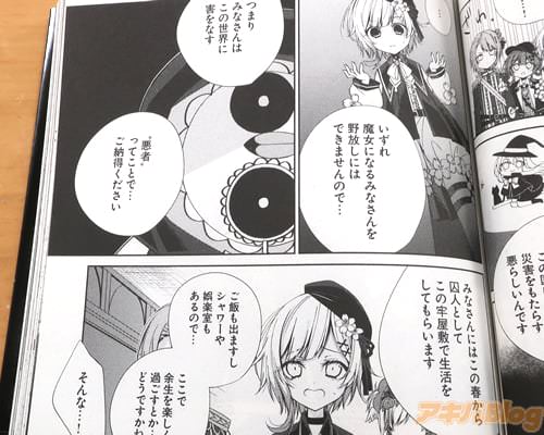 今回発売になったコミカライズ「魔法少女ノ魔女裁判」1巻【AA】には第1話〜第4話を収録し、コミックス情報は『気が付くと監獄に投獄されていた高校生の少女、エマ。監獄内に看守の声が響くとき、残酷なゲームの幕が上がる』で、オビ謳い文句は『美しくも残酷な魔女裁判、ここに開廷――』だった。