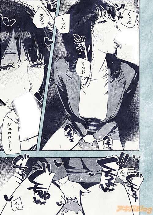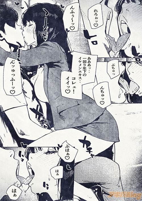 まずは、“べろきす”の名を冠する作者さん持ち前のベロチュー場面から。ふだんは堅実に仕事をこなす成熟しきった社会人女性が、年齢的にも社会的にも格下の若い男へすがりつくように密着して舌と唾液をからめる姿がはしたなくて最高です。