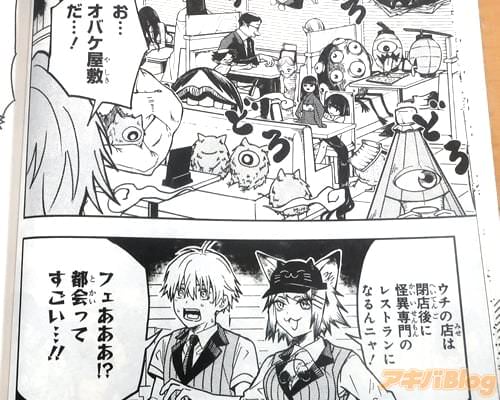 今回発売になった「怪店!トコヤミレストラン」1巻【AA】には第0話から第4話と、「オマケまんが」を収録(もくじ)し、オビには漫画家・漫画原作者:真倉翔氏(「地獄先生ぬ〜べ〜」など)が推薦コメント『次世代の妖怪マンガに星3つ!』などを寄せられていて、裏表紙が『怪異相手に…コメディ!ドラマ!バトルで接客!』、オビ謳い文句は『話題沸騰怪異接客バトルコメディ!』だった。