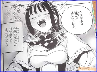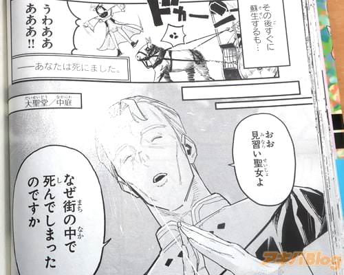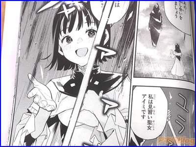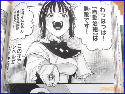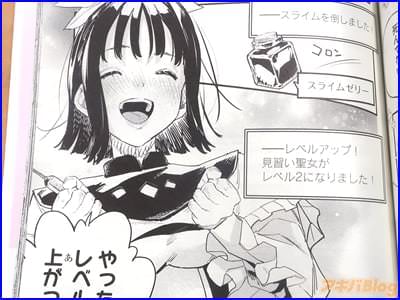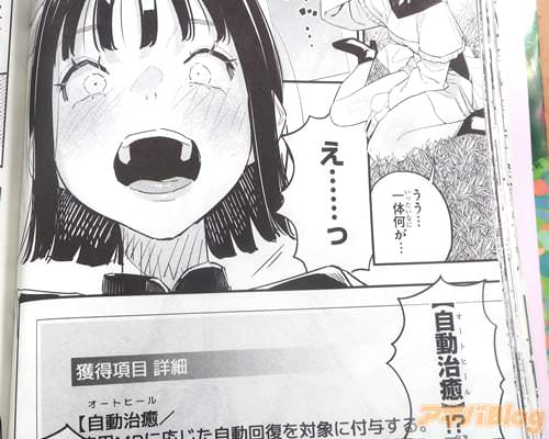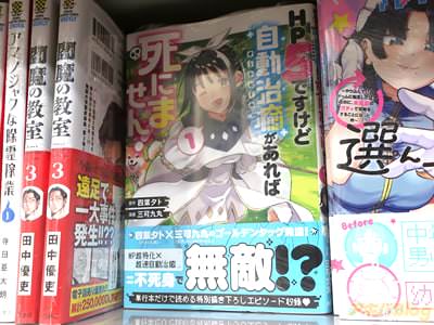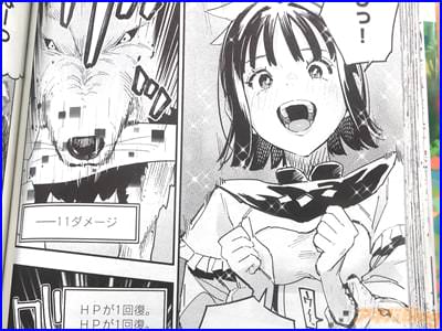 今回発売になったコミカライズ「HP5ですけど自動治癒(オートヒール)があれば死にません!」1巻【AA】には、第1話から第6話と、「特別描き下ろし」を収録(もくじ)し、裏表紙は『天真爛漫聖女伝説物語、開幕!』で、オビ謳い文句は『四葉夕卜×三可九丸のゴールデンタッグ発進!』、『MP超特化×超速自動治癒=不死身で無敵!?』などだった。