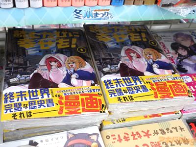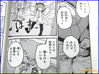 今回発売になったコミックス「読むたびに幸せを!」1巻【AA】には、第1話から第4話と描き下ろし特別エピソードを収録(もくじ)し、裏表紙は『美味しいご飯の作り方も、上手に泳ぐことも、雨を降らせる!?ことも、漫画は何でも教えてくれる!』で、オビ謳い文句は『漫画を読めば滅びた世界でだって、楽々生きられる…はず!?』、『終末世界における完璧な歴史書、それは――“漫画”!』だった。