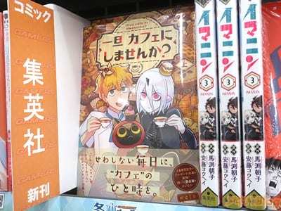 今回発売になったコミックス「一旦カフェにしませんか?」上巻【AA】には、第1話から第8話と「びわの趣味」、「盛り盛り」、「ウィートの部屋」、「食べづらい」、「きっかけと思い出」を収録(もくじ)し、裏表紙は『不思議でおいしいお菓子がたくさん!』、『のんびりまったり、“カフェ”でお寛ぎください』で、オビ謳い文句は『せわしない毎日に、“カフェ”のひと時を』、『「少年ジャンプ+」発、やさしくておいしいグルメファンタジー開幕!』だった。