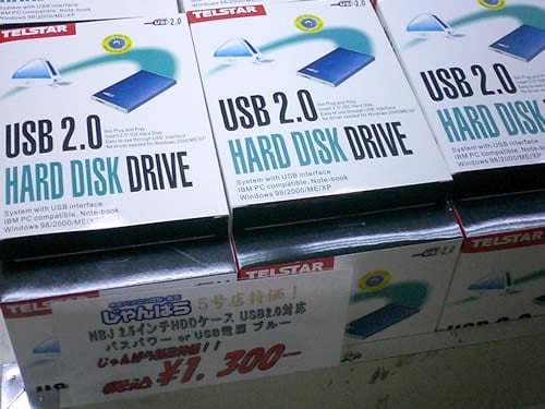 じゃんぱら各店やドスパラではNBJの2.5インチ用USB2.0対応HDDケースが1300円程度で販売され、パッケージ表面にはiMacが描かれているが、対応OSの表記を見ると、Windows98/Me/2000/XPとなっており、Macでの動作についてはパッケージ表面には書かれていなかった。じゃぱら5号店でのPOPには注意書きは見つからなかったが、じゃんぱら本店やドスパラ2号店では「東芝のHDDは使えないかも」や「東芝等一部のHDDを相性あり」とPOPに書いてあったので、購入の際は注意が必要かもしれない。